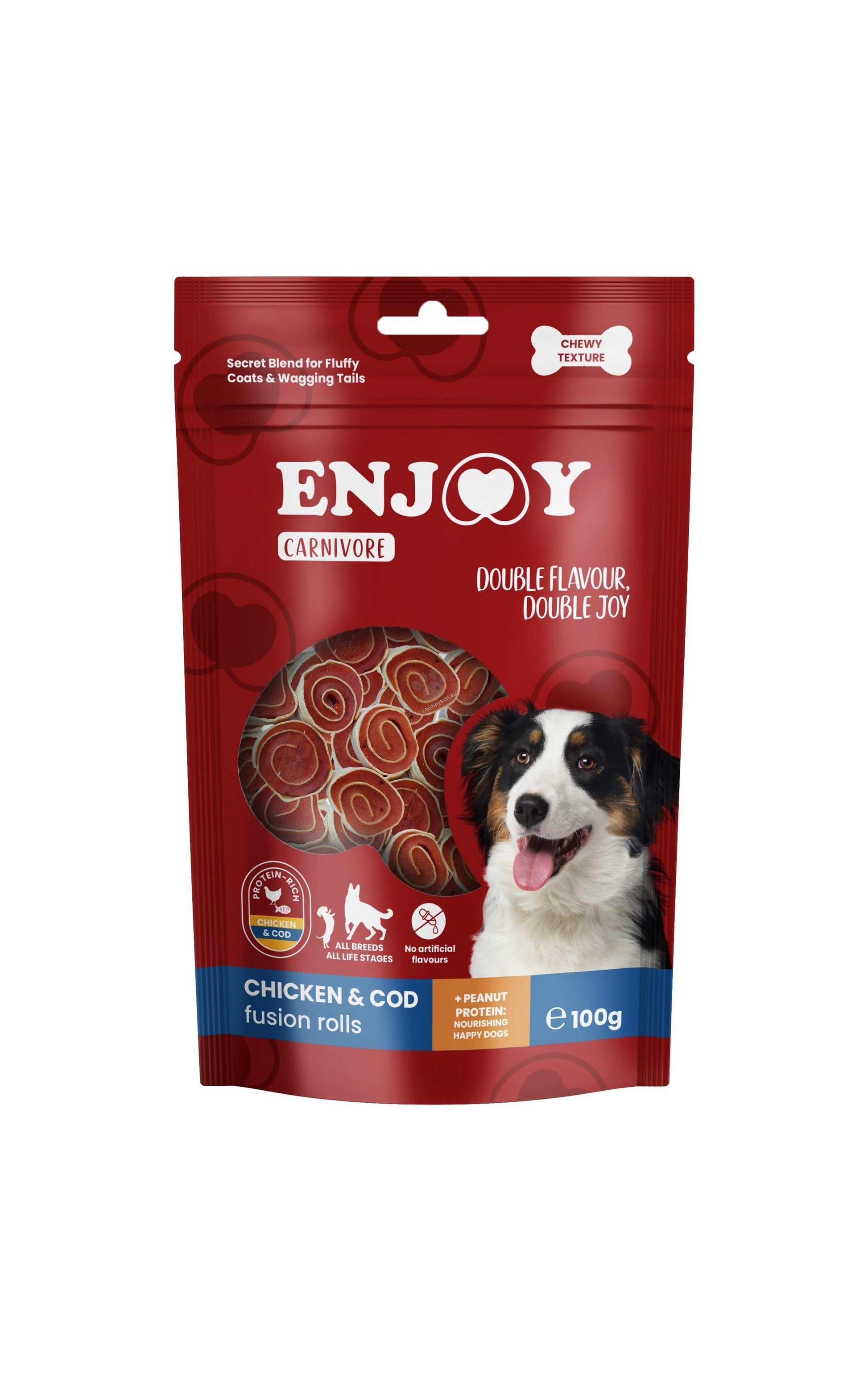 РАЗПРОДАЖБА Enjoy Carnivore Chicken and Cod Fusion Rolls - лакомство за куче с пилешко месо и треска 100 гр