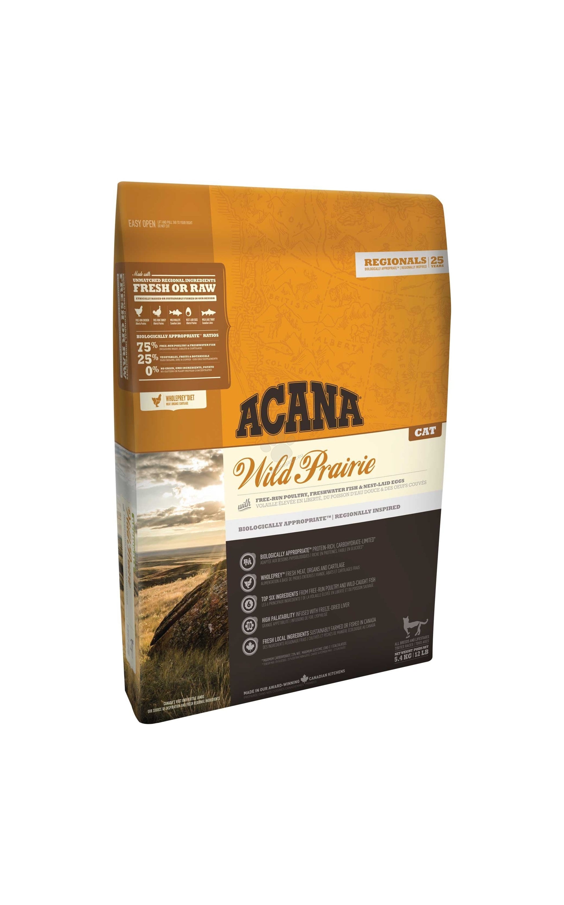 Канадската фирма Acana използва само локални продукти от най-високо качество. Те се доставят ежедневно, съвсем пресни, от местни фермери, земеделци и рибари. Месо, дроб, сърце, бъбреци и хрущяли от свободно отглеждани кокошки и пуйки, бяла риба и езерна пъстърва от свободен улов от най-чистите води на Канада, цели яйца от свободно отглеждани кокошки, както и местни плодове и зеленчуци предоставят изобилие от животински протеини и разнообразие от хранителни вещества. Затова и не е необходимо храната да се дообогатява със синтетични добавки. Само един поглед върху списъка с продуктите е достатъчен да се уверите в качеството на храната ACANA Regionals Wild Prairie Cat! Качествен продукт за кучета с претенции, в който се крие частица от богатата и чиста природа на Канада.
