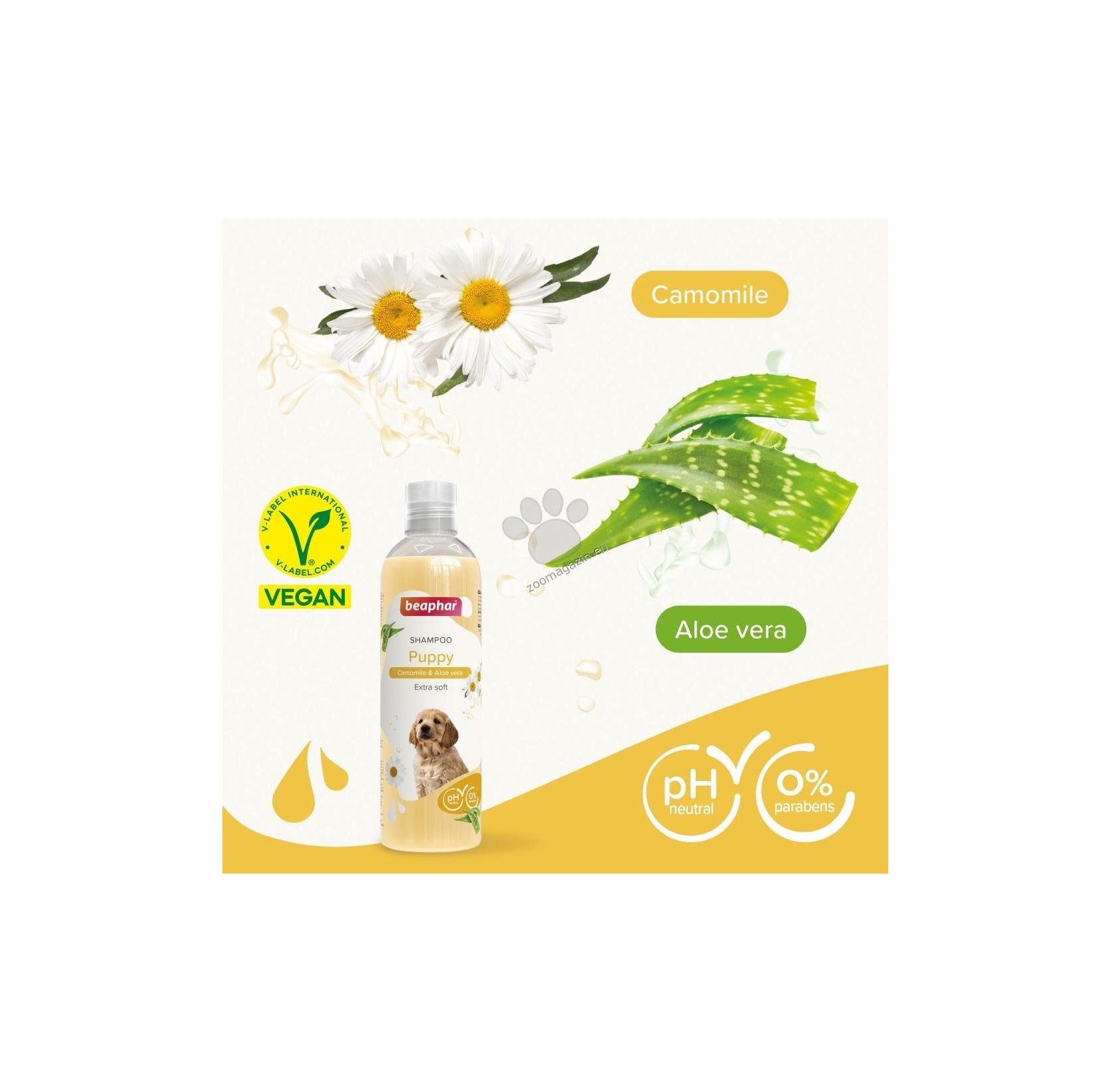 Beaphar Shampoo Puppy - шампоан с алое вера за малки кученца e мек, pH-неутрален шампоан, специално създаден за чувствителната кожа на малки кученца. Той съдържа лайка и алое вера и помага за поддържането на мекотата на козината на вашето кученце.