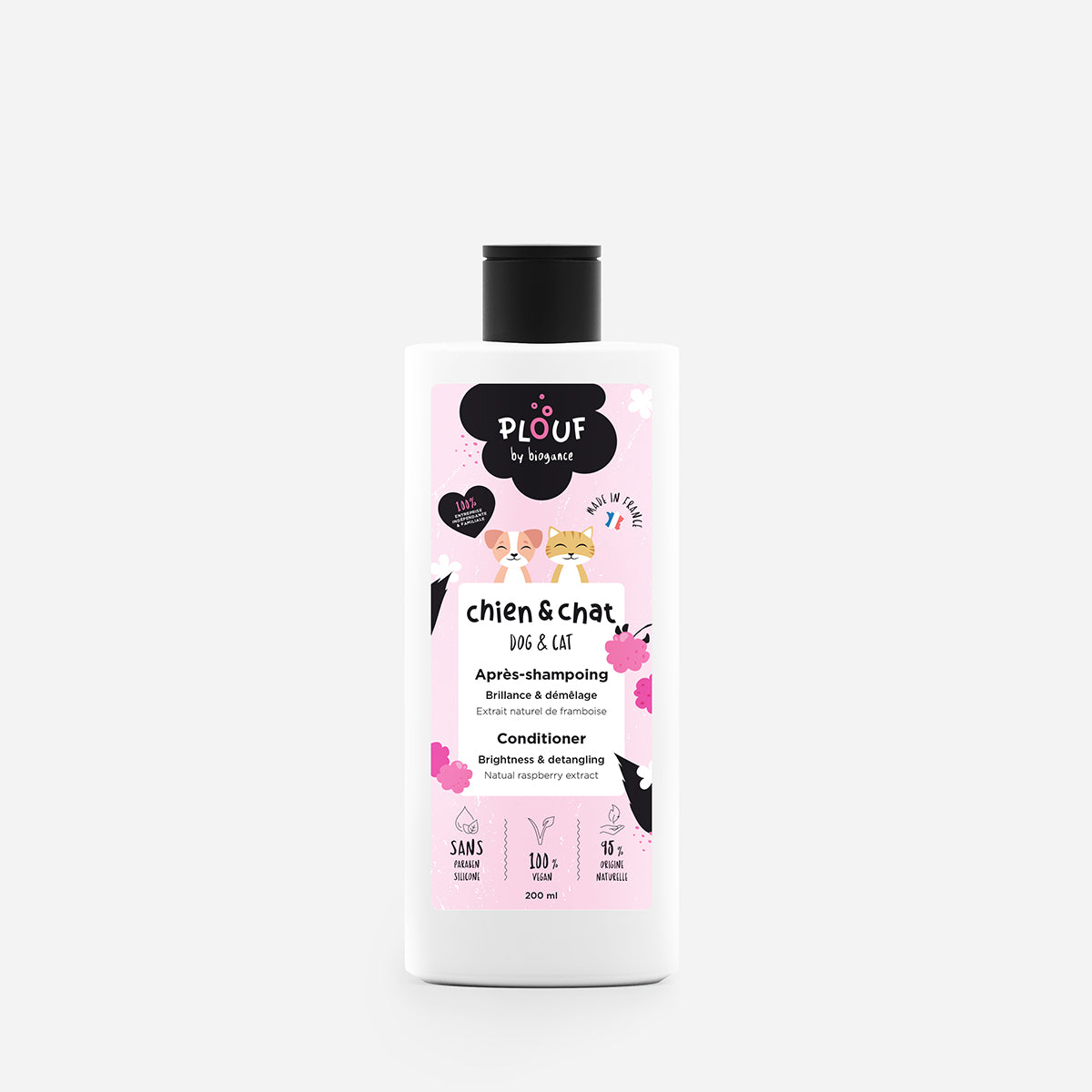 Балсамът Plouf за кучета и котки е формулиран с екстракт от малина. Той подхранва в дълбочина, улеснява разресването и придава блясък на козината.