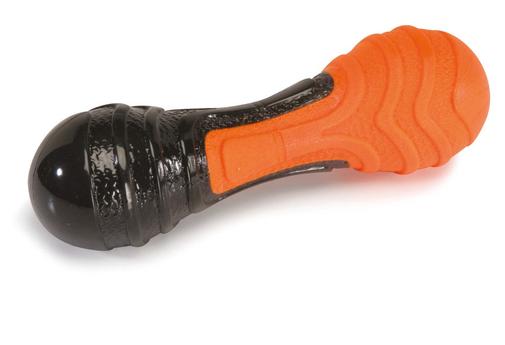 Забавна, двуцветна играчка за кучета във формата дъмбел (черно и оранжево).