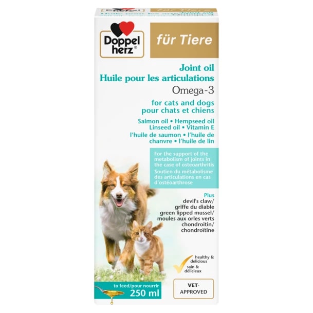 Допелхерц® für Tiere Омега-3 масло за Стави е диетична допълваща храна за котки и кучета, съчетаваща висококачествени масла и специално подбрани активни съставки в подкрепа на метаболизма на ставите при остеоартроза: