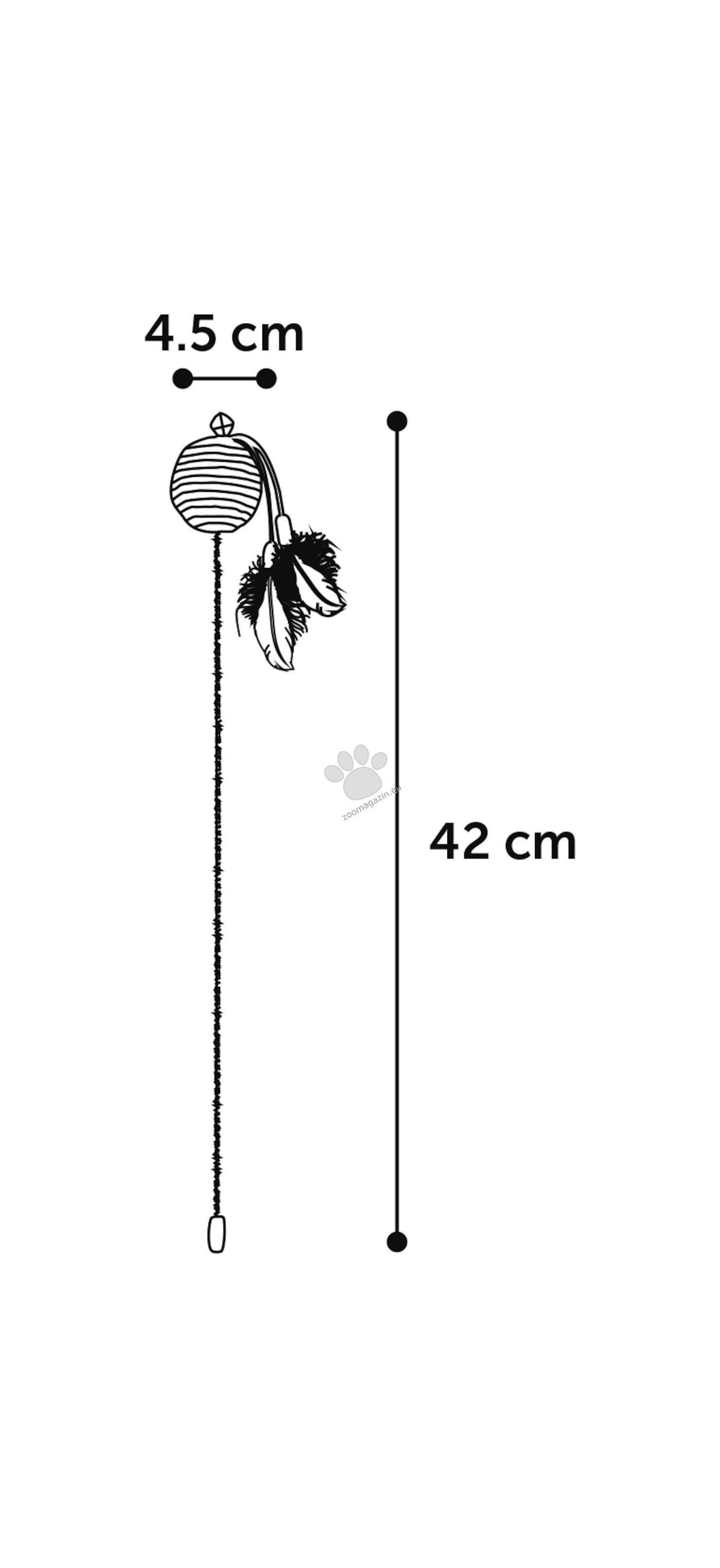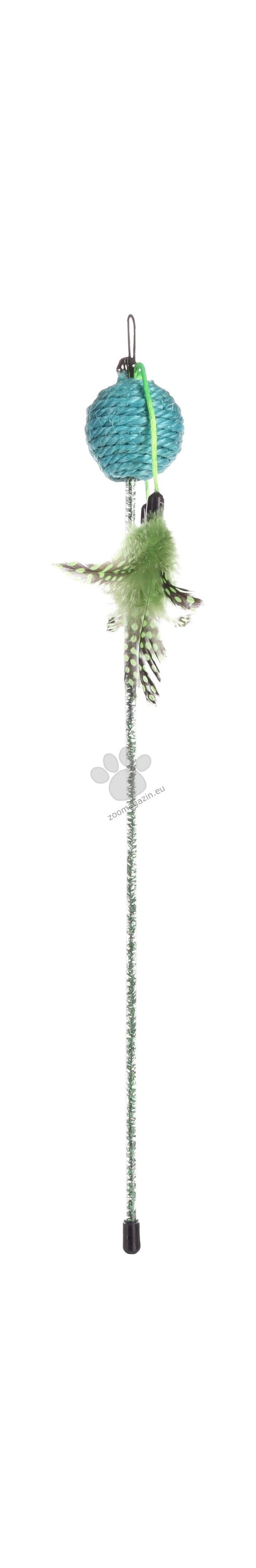Пластмасовата въдица се предлага с играчка от сезал, която ще разпали ловните инстинкти на вашата котка. Има блясък, малка топка, дрънкащо котешко звънче и пера за допълнително забавление и игри!