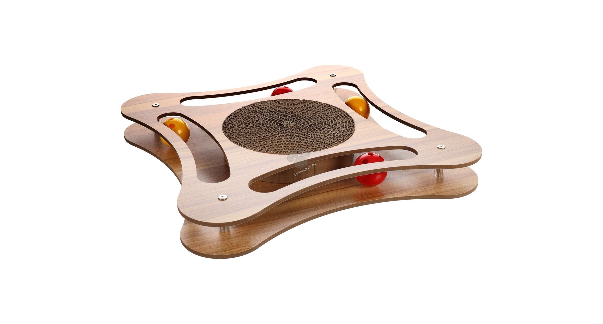 Тази играчка е идеална за вашата котка! Изработена от MDF и картон, с 4 дрънчащи топки и торбичка от котешка трева. Вашата котка няма да може да устои на естествения си ловен инстинкт!