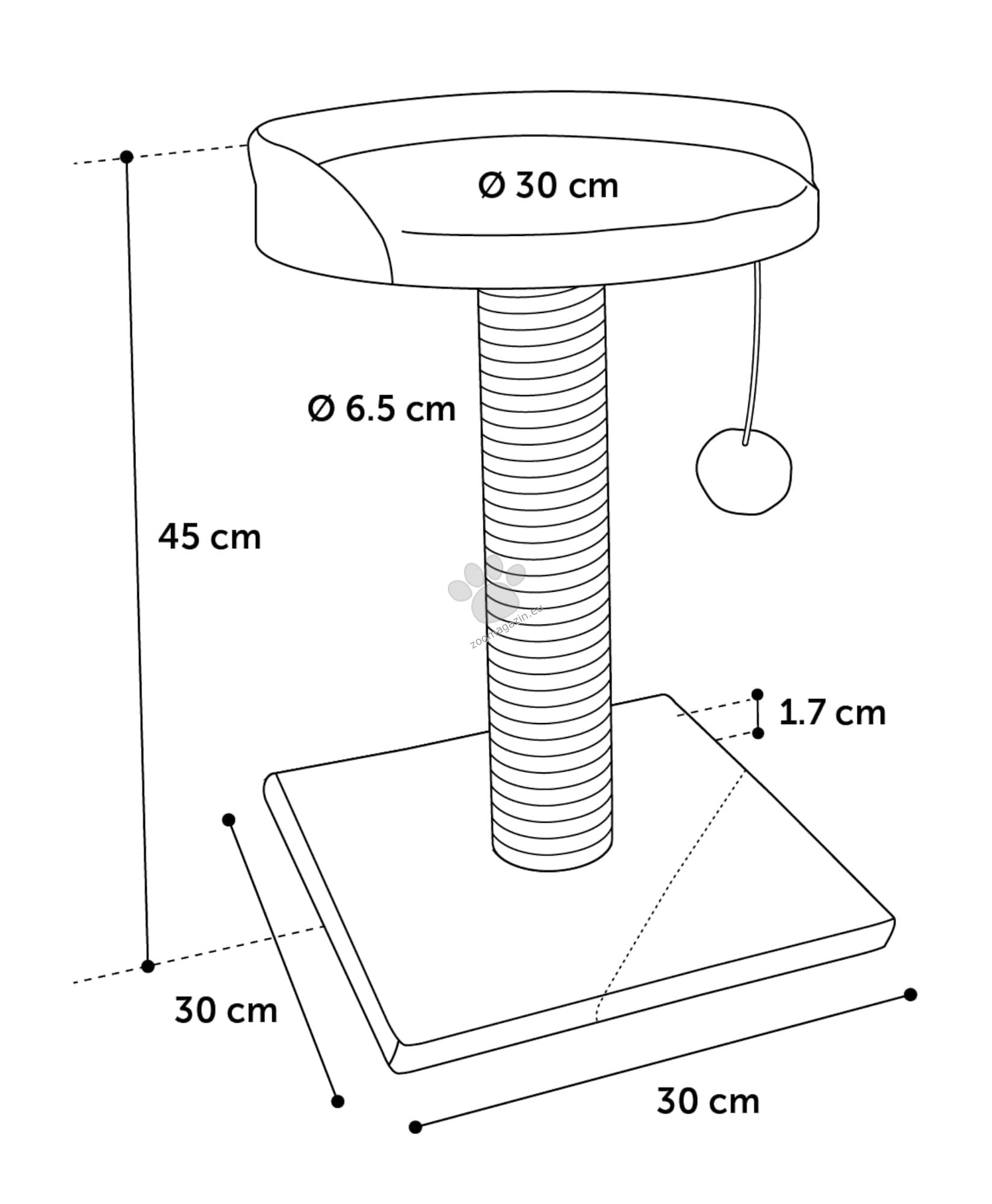 Осигурете на котката си уютно място за почивка и драскане с тази сива драскалка. С диаметър 6,5 см и 4 мм ютено въже, вашата котка може да си точи ноктите до насита. Освен това има топка за игра на връв и мека плюшена платформа за дрямка.