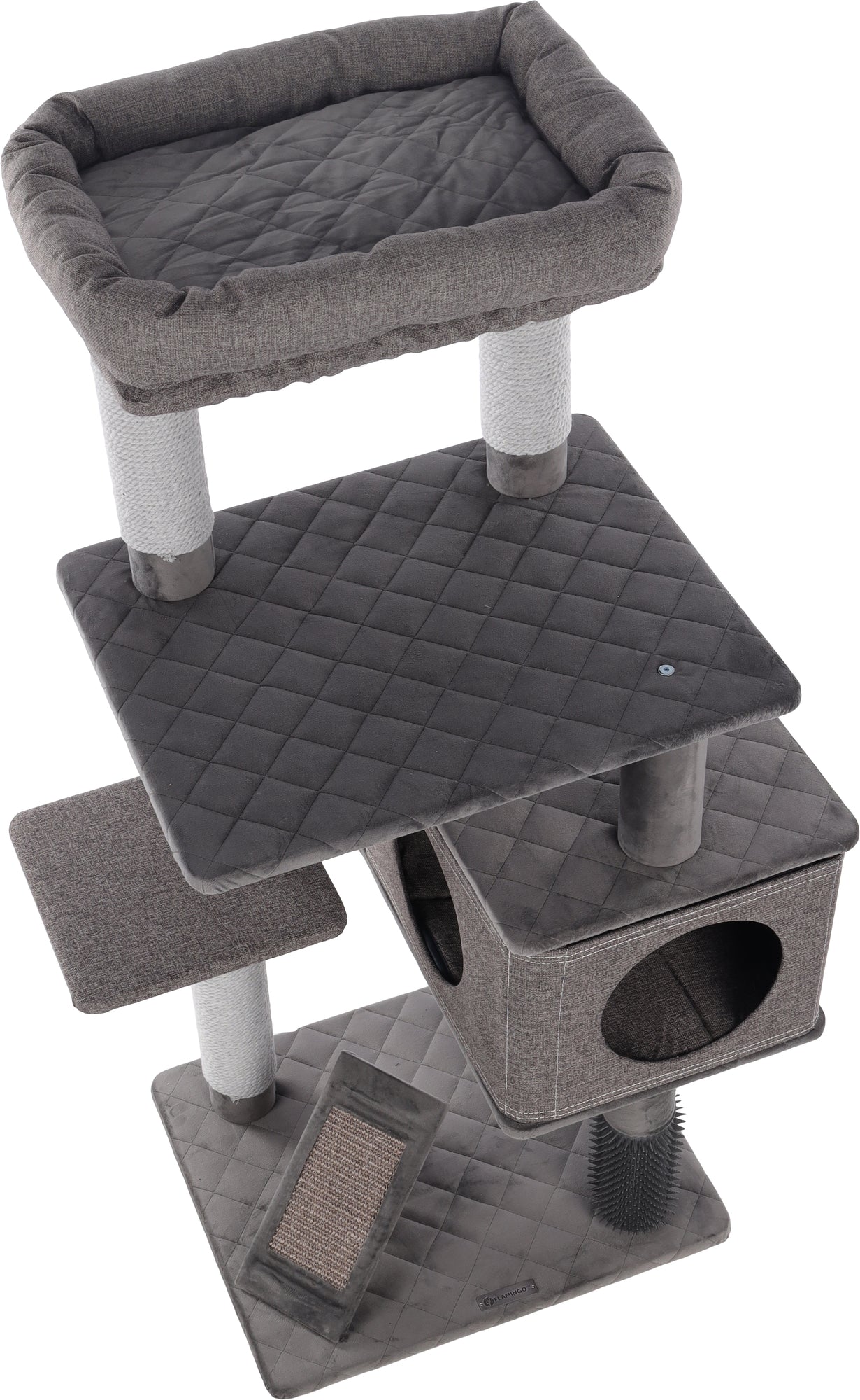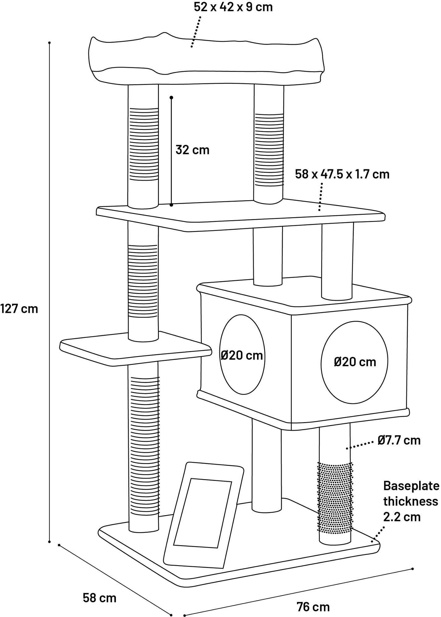 Дървото за котки Halo е идеалното място за вашия котешки приятел да играе, да драска и да се отпусне. Изработено от здравo ПДЧ и мека материя, това дърво за котки се гордее с щедър диаметър от 77 см и разполага с памучно въже и сизалова подложка за драскане. Подплатените платформи за отдих и скривалището с подвижна възглавница осигуряват максимален комфорт. Подвижната кошница и възглавницата са лесни за почистване, а гумената повърхност осигурява възхитителен масаж за вашата котка. Поглезете котето си с това луксозно дърво за котки и го гледайте как мърка от удоволствие!