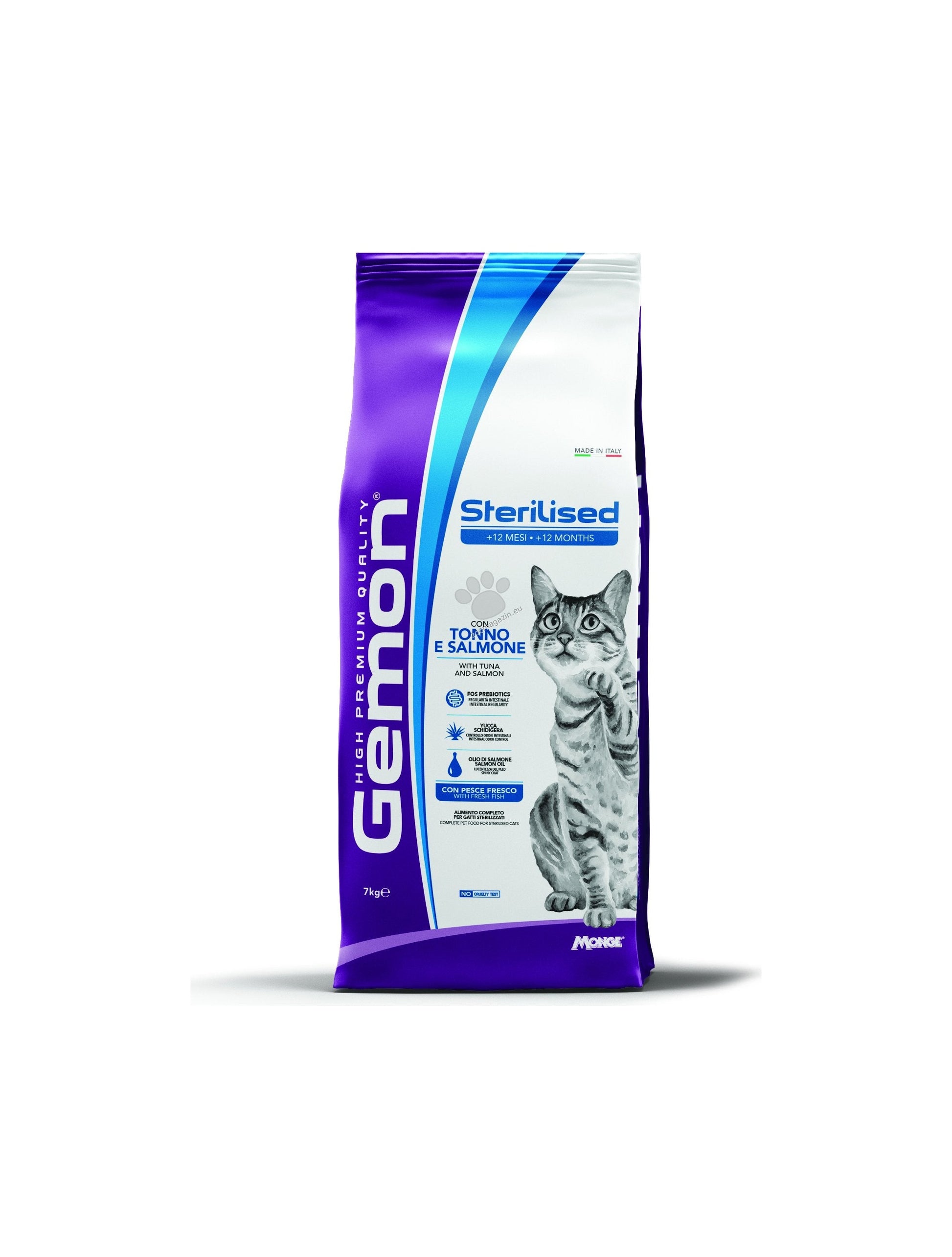 Gemon Sterilised Cat With Tuna And Salmon е пълноценна храна за кастрирани възрастни котки над 12 месеца. Формулата се характеризира с висококачествени съставки и източници на основни хранителни вещества като риба тон и сьомга и източник на въглехидрати, като ориз, сготвен и лесно смилаем благодарение на процеса на екструдиране. Идеална храна за кастрирани котки, с добавени пребиотици фрукто-олигозахариди (FOS) и мано-олигозахариди (MOS) за поддържане на здравето на червата и с пулпа от цвекло, за да поддържат идеално телесно тегло. Рецептата съдържа прясна риба за оптимален вкус и масло от сьомга, за да поддържа козината лъскава и мека. Също така съдържа юка шидигера за ограничаване миризмата на фекалиите. Без добавени изкуствени оцветители и консерванти.