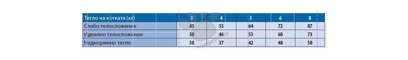 Инструкции за употреба: Препоръчителният дневен хранителен прием (вижте таблицата) може да бъде разделен на 2 дневни хранения. Индивидуалните хранителни нужди могат да варират в зависимост от размера, възрастта и нивото на активност на животното. Трябва да има прясна и чиста вода на разположение по всяко време . Когато този продукт замества друг вид храна и/или диета, се препоръчва да се въведе постепенно за период от поне една седмица.