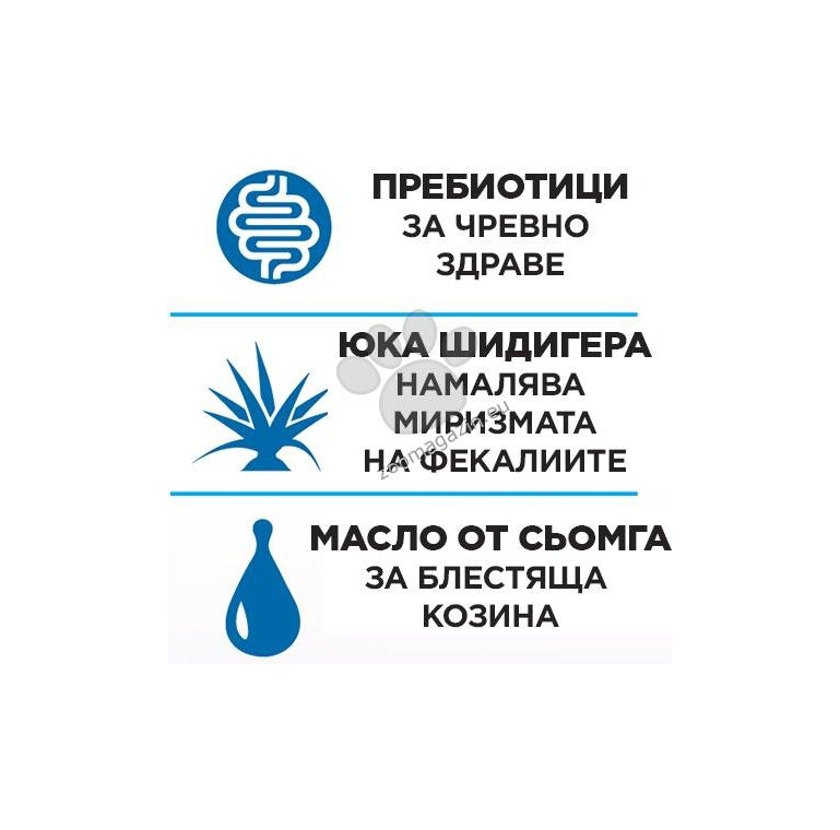 Състав: Зърнени култури (ориз 4%), риба и рибни производни продукти 30% (прясна риба тон 8% и прясна сьомга 8%), месо и животински производни продукти, зеленчуци (цвеклова каша 2%), масла и мазнини (масло от сьомга 1%), производни продукти от растителен произход (фрукто-олигозахариди FOS 0,5% и юка шидигера 0,1%), минерали, дрожди (манан-олигозахариди MOS 0,5%).