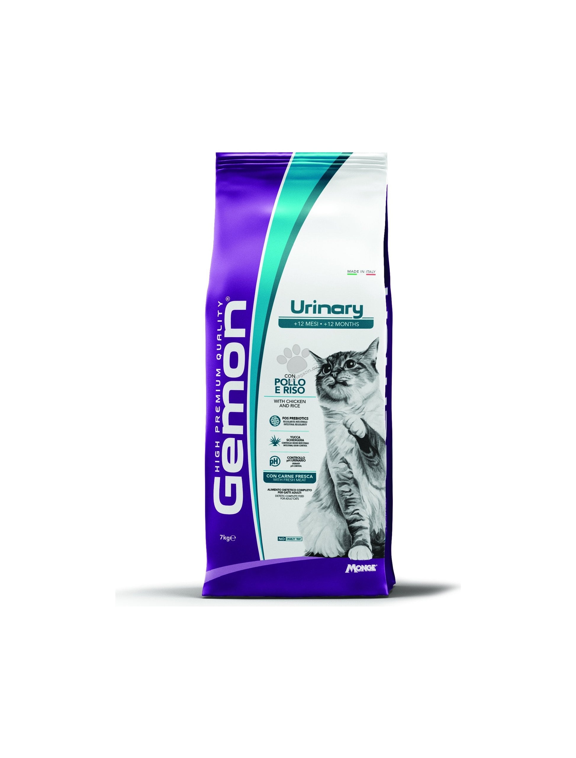 Gemon Urinary Cat With Chicken And Rice е пълноценна храна за намаляване на повторната поява на струвитни камъни при възрастни котки. Формулата подкиселява урината и съдържа умерено ниво на магнезий (Mg). Храната съдържа висококачествени съставки и източници на основни хранителни вещества като пиле, сготвено и направено лесно смилаемо благодарение на процеса на екструдиране. Идеална храна за възрастни котки, с добавени пребиотици фрукто-олигозахариди (FOS) и мано-олигозахариди (MOS) за поддържане на здравето на червата и юка шидигера за ограничаване на миризмата на фекалиите. Рецептата включва прясно месо за оптимален вкус и масло от сьомга, за да запази козината лъскава и мека. Без добавени изкуствени оцветители и консерванти.