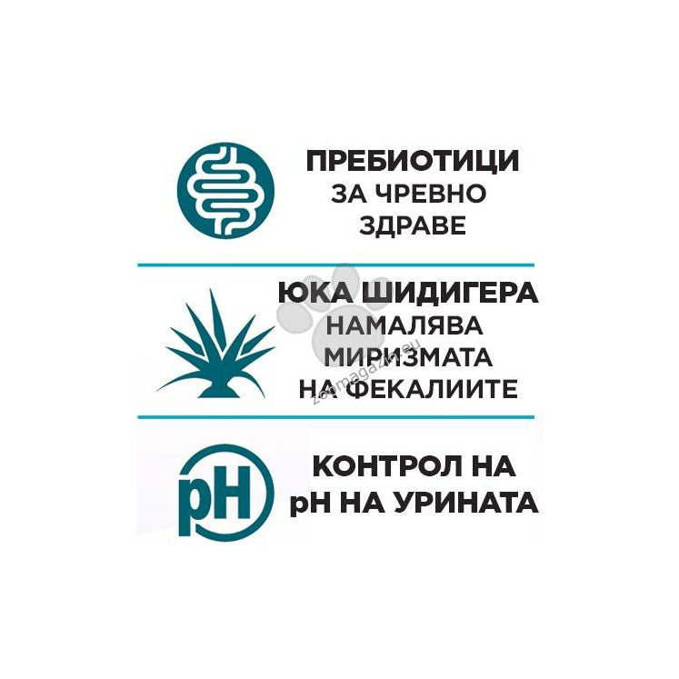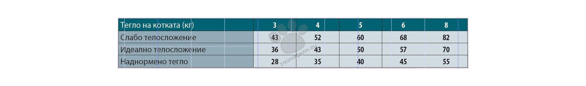 Инструкции за употреба: Препоръчително е да се потърси съвет от ветеринарен лекар преди употреба и преди удължаване на периода на употреба. Препоръчителна продължителност на употреба: първоначално до 6 месеца. Препоръчителният дневен прием на храната (вижте таблицата) може да бъде разделен на 2 дневни хранения. Индивидуалните хранителни нужди могат да варират в зависимост от размера, възрастта и условията на живот на животното. Трябва да има прясна и чиста вода на разположение по всяко време. Когато този продукт замества друг вид храна и/или диета, се препоръчва да се въведе постепенно за период от поне 1 седмица.