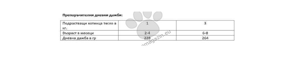 Инструкции за употреба: за коте на възраст 4-8 месеца се препоръчва дневна дажба от 228 - 264гр/ дневно, която може да се раздели на 3 хранения. Осигурете постоянен достъп до прясна и чиста вода. Когато тази храна замества друга, се препоръчва постепенното въвеждане за период от поне 1 седмица.