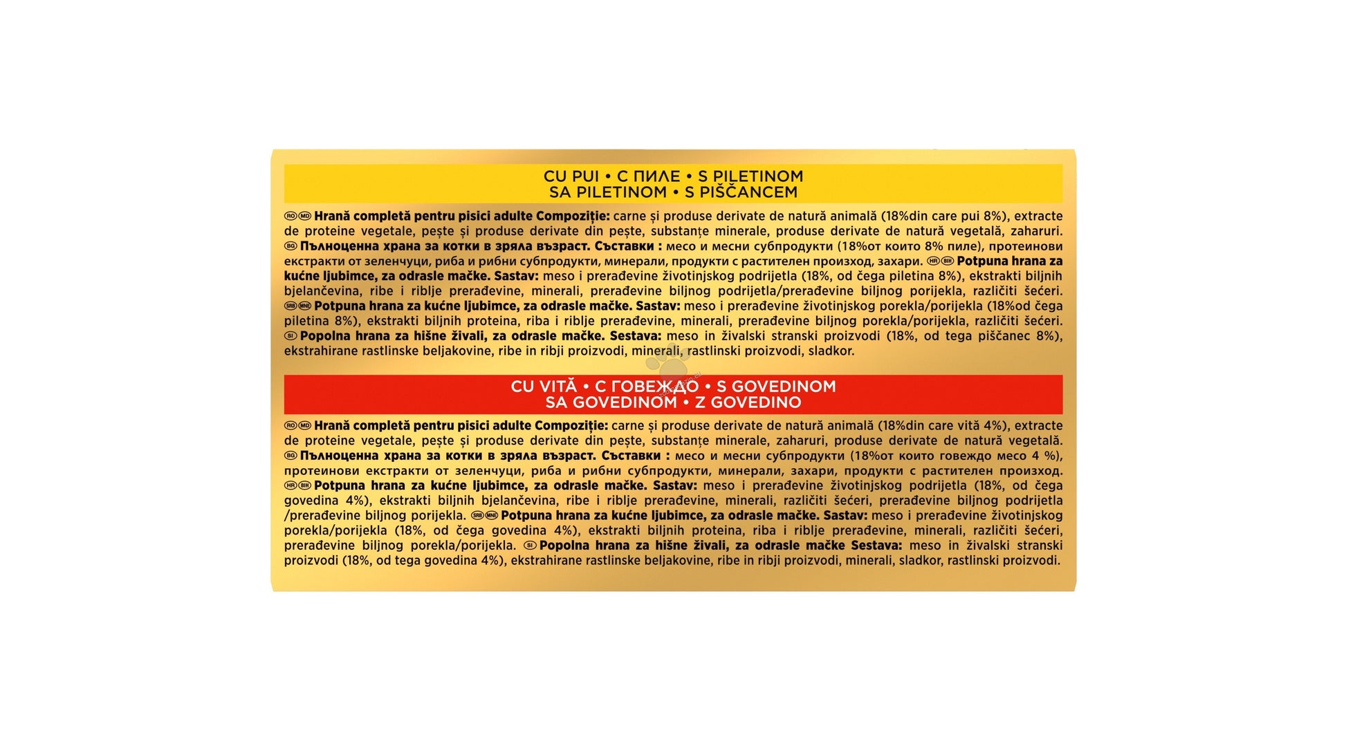 Съставки :месо и месни субпродукти (18%от които говеждо месо 4 %), протеинови екстракти от зеленчуци, риба и рибни субпродукти, минерали, захари, продукти с растителен произход.