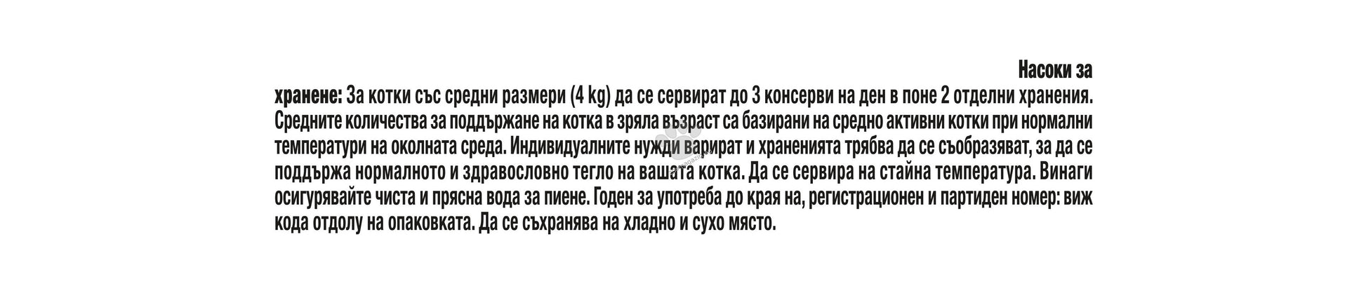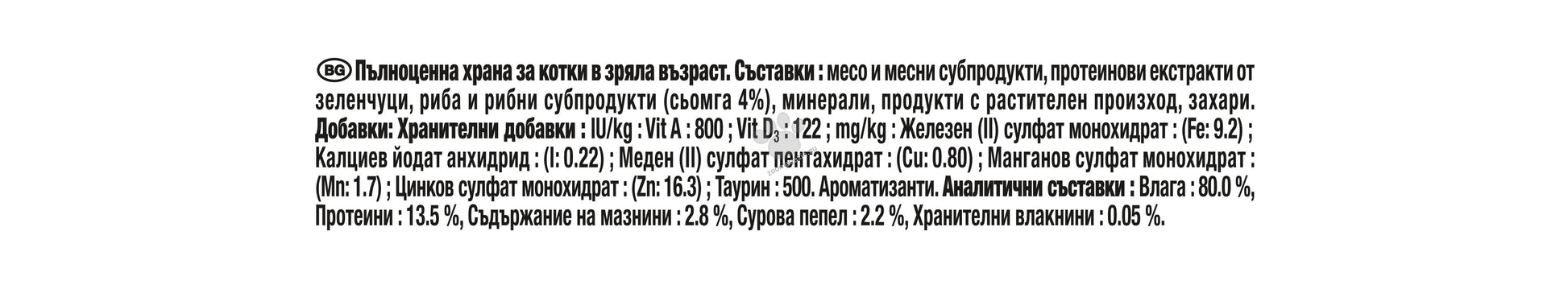 месо и месни субпродукти, протеинови екстракти от зеленчуци, риба и рибни субпродукти (сьомга 4%), минерали, продукти с растителен произход, захари.