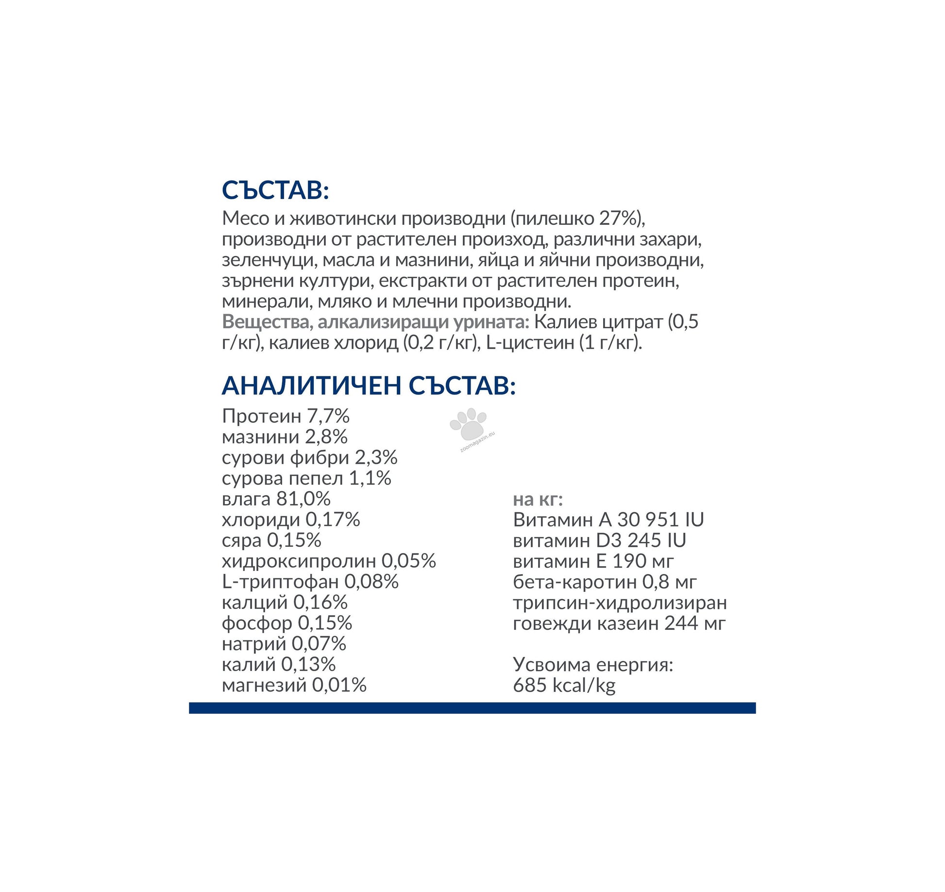 СЪСТАВ: Месо и животински производни (пилешко 27%), производни от растителен произход, различни захари, зеленчуци, масла и мазнини, яйца и яйчни производни, зърнени култури, екстракти от растителен протеин, минерали, мляко и млечни производни. Вещества, алкализиращи урината: Калиев цитрат (0,5 г/кг), калиев хлорид (0,2 г/кг), L-цистеин (1 г/кг).