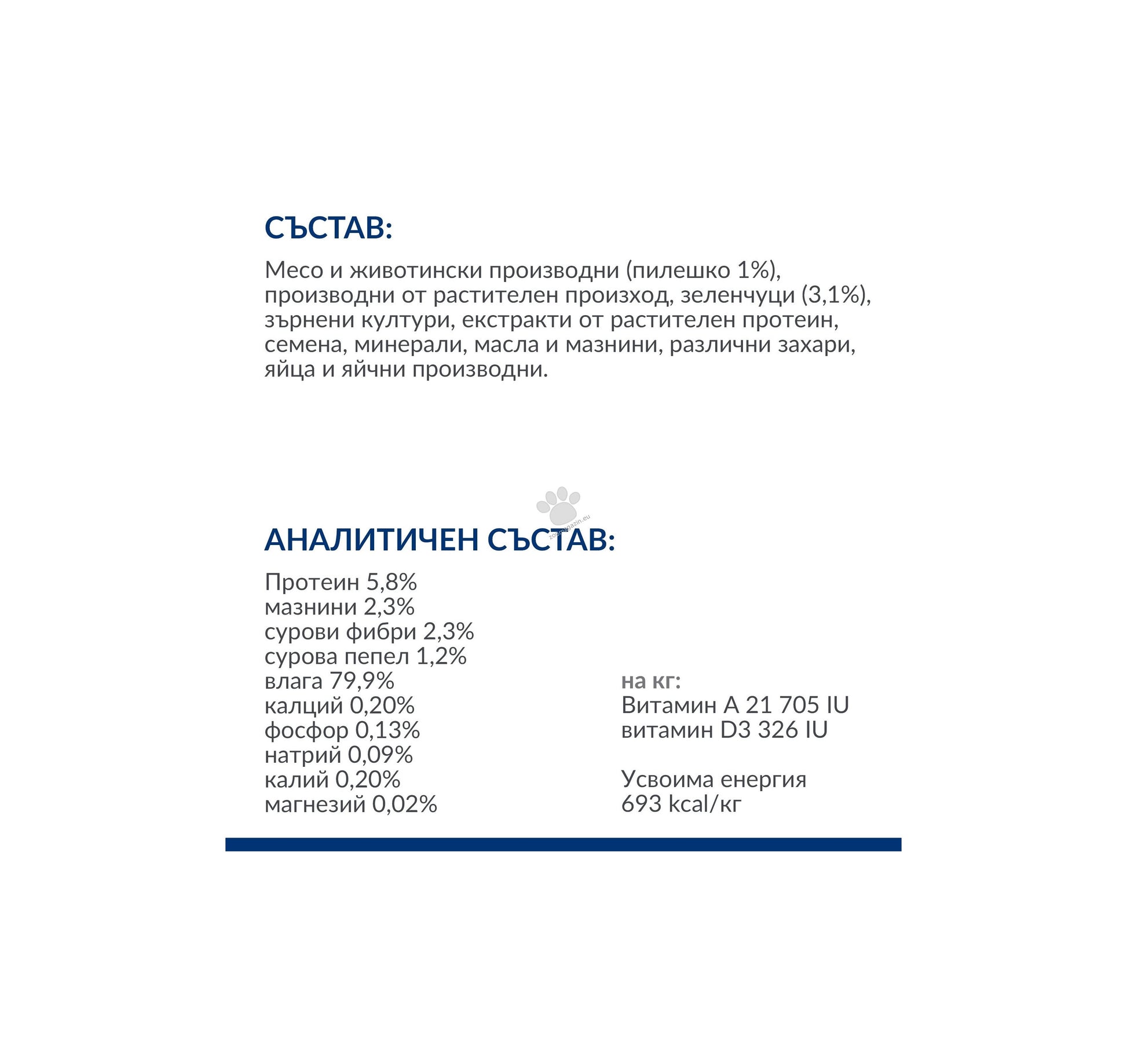 АНАЛИТИЧЕН СЪСТАВ: протеини: 5,8%; мазнини: 2,3%; сурови влакнини: 2,3%; сурова пепел: 1,2%; влага: 79,9%; калций: 0,20%; фосфор: 0,13%; натрий: 0,09%; калий: 0,20%, магнезий: 0,02%. ЗА КГ: витамин А: 21705IU, витамин D3: 326IU