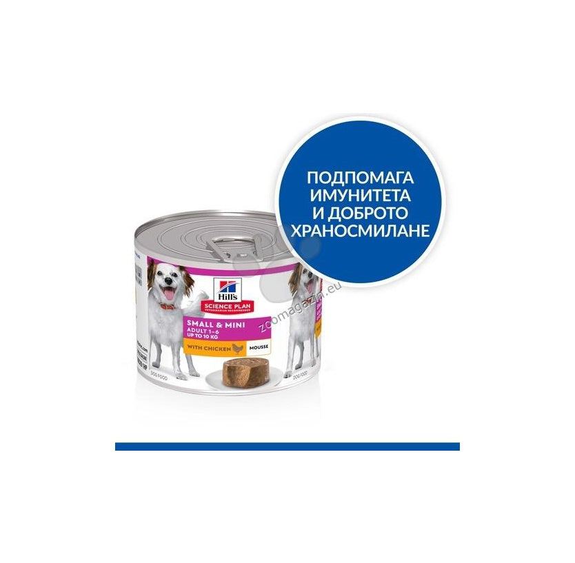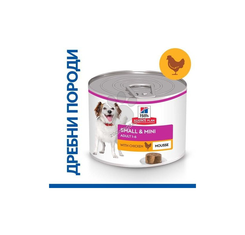 Hill's Science Plan Small & Mini Adult Mousse Chicken е пълноценна храна с мека текстура за израснали кучета от дребни породи на възраст 1–6 години. Тази храна е формулирана за специфичните нужди на кучетата от дребни и мини породи в разцвета на живота им.