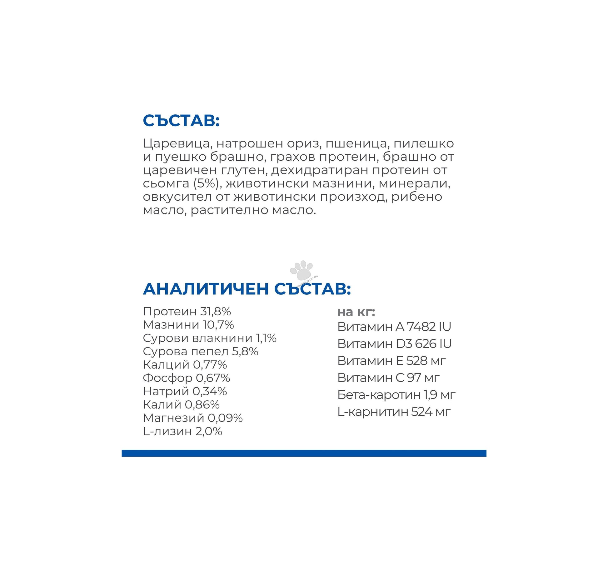 СЪСТАВ: царевица, натрошен ориз, пшеница, пилешко и пуешко брашно, грахов протеин, брашно от царевичен глутен, брашно от сьомга (5%), животинска мазнина, минерали, животински овкусител, рибено масло, растително масло.