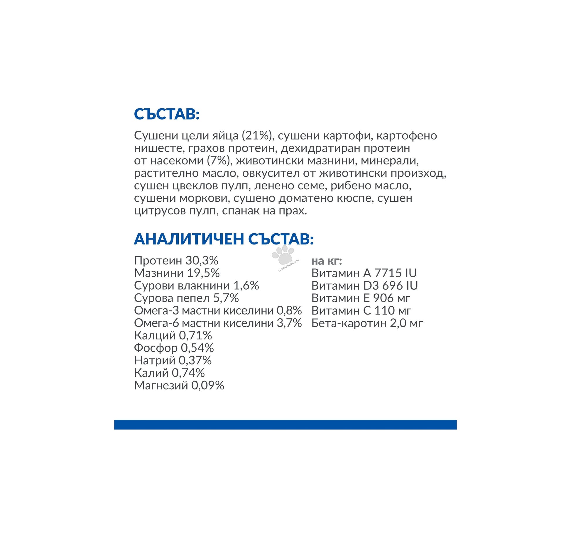 СЪСТАВ: Сушени цели яйца (21%), сушени картофи, картофено нишесте, грахов протеин, дехидратиран протеин от насекоми (7%), животински мазнини, минерали, растително масло, овкусител от животински произход, сушена цвеклова пулпа, ленено семе, рибено масло, сушени моркови, сушено доматено кюспе, сушена цитрусова пулпа, спанак на прах.