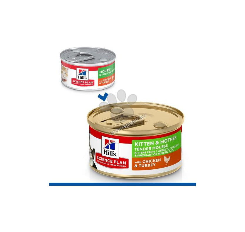 Hill’s Science Plan Kitten & Mother Mousse Chicken and Turkey е пълноценна и балансирана храна с гладка текстура за котенца и бременни или кърмещи котки. Този нежен мус за котки и котенца е формулиран да осигури нужната енергия на котенцата в началото на живота им и на котките по време на кърмене.