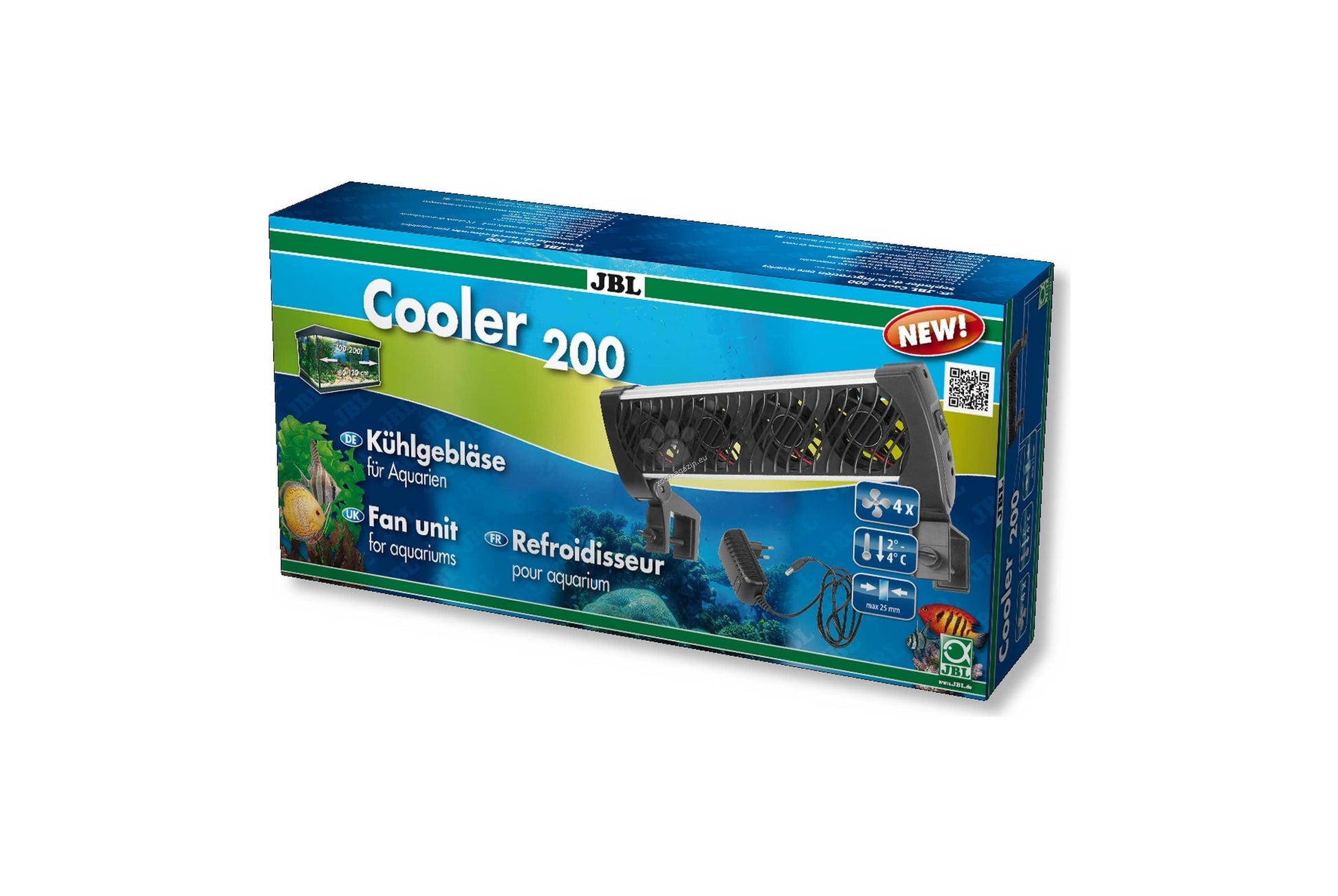Охладителят JBL за сладка вода и солена вода се охлажда с 2-4 ° C с помощта на вентилаторите. Вентилаторът кара топлата вода да се изпари на повърхността на водата и по този начин генерира студ. Съпоставимо с изпарителното охлаждане на мокра част на тялото, която е изложена на вятъра.