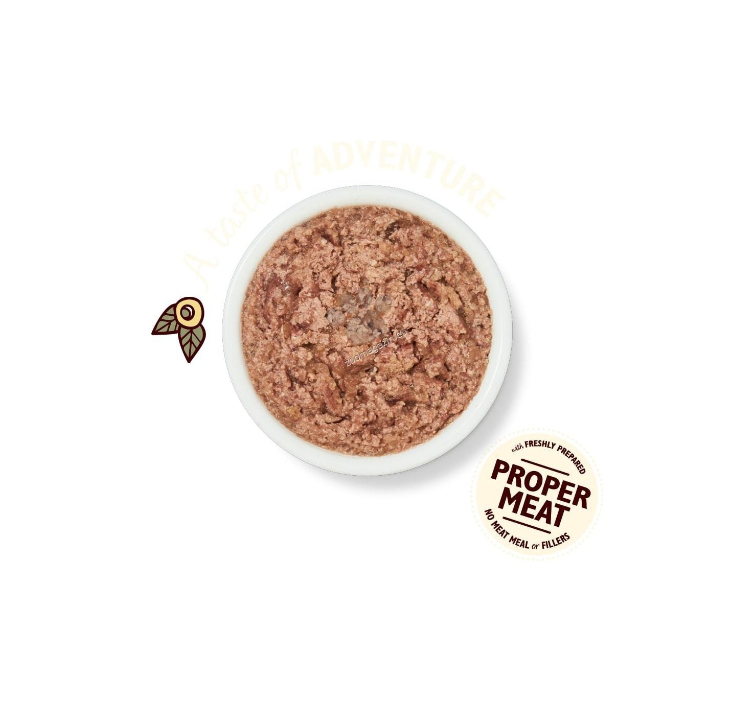 Състав: Пиле (25%), дивеч (15%), свинско (15%), пуешко (10%), минерали, масло от сьомга, водорасли.