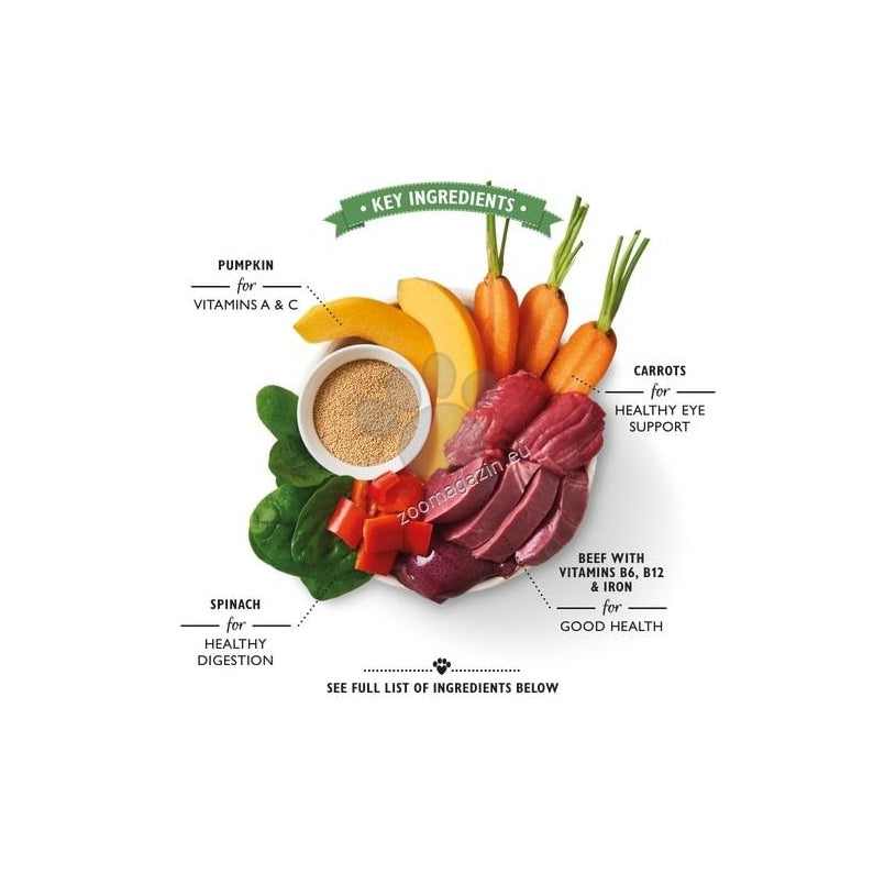 Тази рецепта е внимателно разработена с помощта на естествени съставки, с витамини и минерали. Приготвена с истинско, първокласно прясно месо и зеленчуци, тя не съдържа заместители на месо.