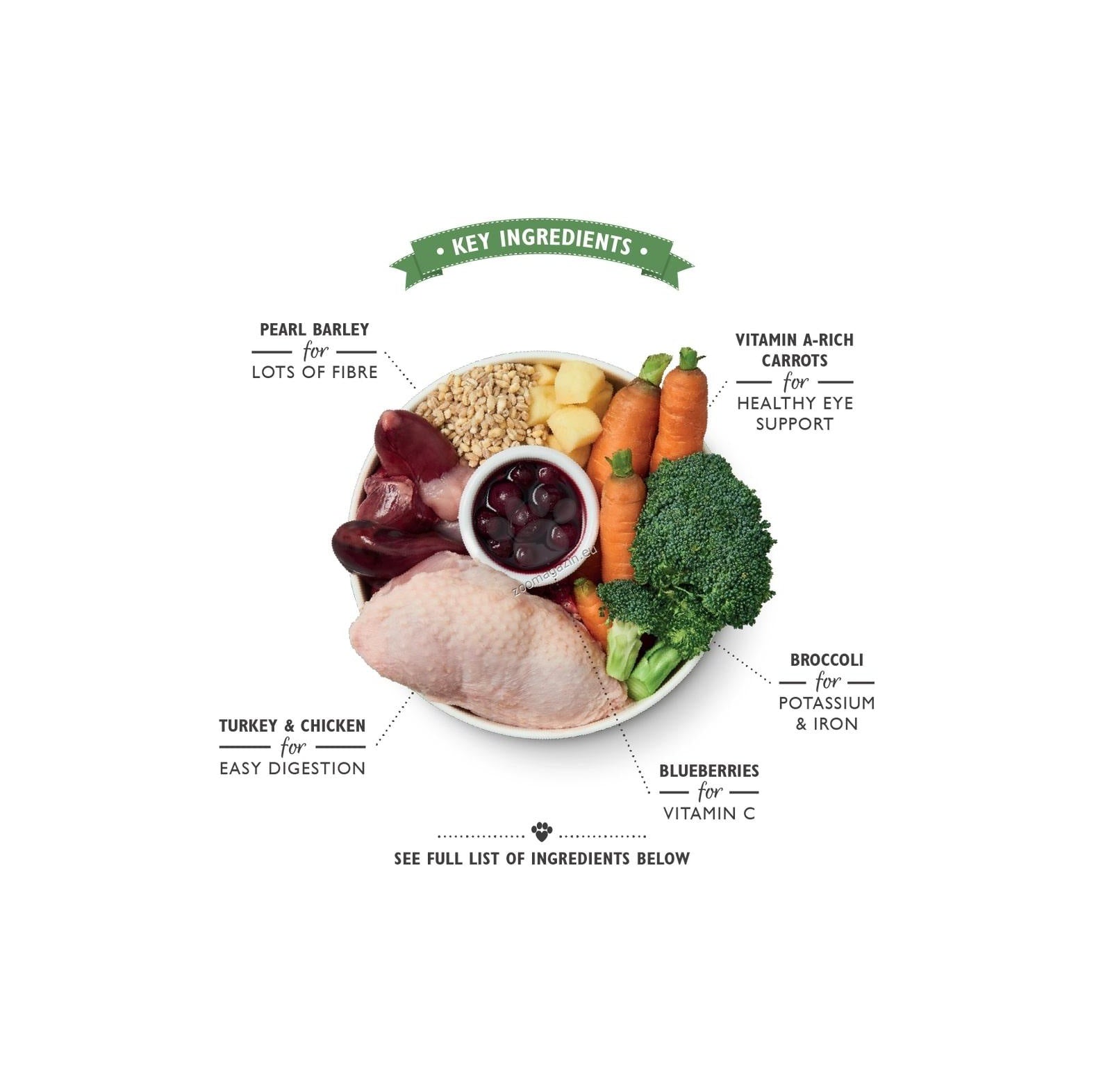 Вкусна, пълноценна рецепта, приготвена с прясно пилешко и пуешко месо, кафяв ориз, зеленчуци и плодове – ябълки, броколи, грах и боровинки и здравословни билки. Също така сме добавили всички основни витамини и минерали, от които вашият домашен любимец се нуждае за една наистина питателна диета. Тази рецепта е без зърно и е пълна с естествени хранителни съставки.