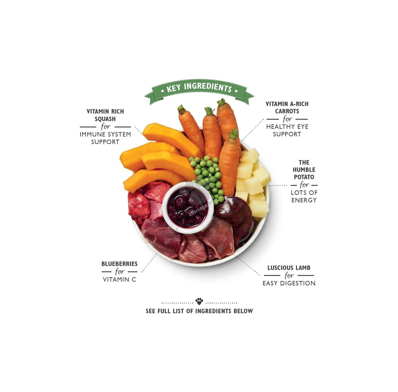 Прясно приготвено агнешко (60%); Картофи (3%); Тиква (2%); Ябълки, моркови (1%)