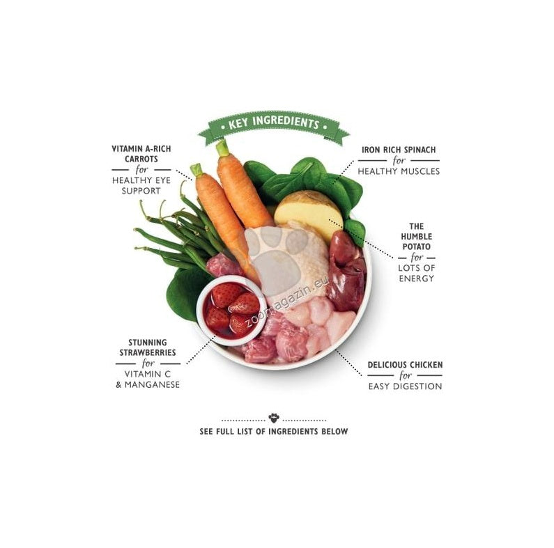 Състав: Пиле (65%), картофи (2%), моркови (2%), зелен фасул (1%), спанак (1%), ягоди (1%), минерали, конопено масло, златна пръчица, коприва, анасон, шипки, Цветя от невен, кълнове, мацка, люцерна, бял трън, корен от глухарче, корен от репей, семена от целина.