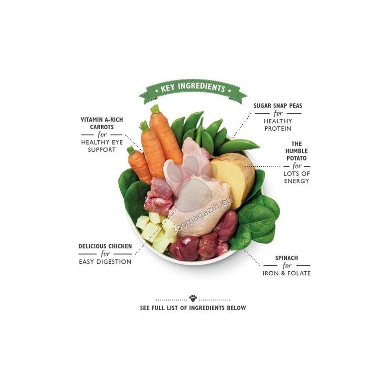 Състав: Пиле (60%); Картофи (4%); Захарен грах (2%), моркови, спанак, ябълки, витамини и хелатни минерали, билки, шафраново масло