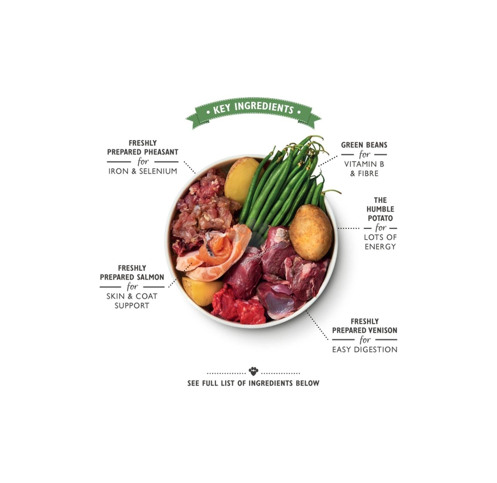 Неустоима пълноценна рецепта без зърнени храни, приготвена с прясно приготвено еленско месо, фазан и сьомга. Тази кучешка храна може да бъде чудесен алтернативен избор за тези, които са чувствителни към традиционните източници на протеини. Всяка страхотна порция е направена със здравословни, вкусни зеленчуци: картофи и тиква, заедно с нашата уникална комбинация от растителни продукти.