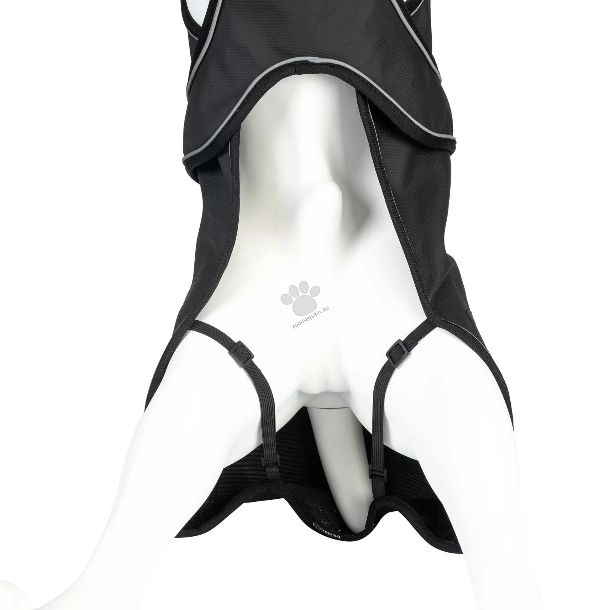 Благодарение на широката яка, обличането е изключително лесно. С еластична връзка на врата можете да регулирате размера по ваше желание. Регулируемия колан за корема, както и регулируемите ластици за задните крака осигуряват оптимално прилягане. Имате възможност да закрепите повода през два отвора за нагръдника или нашийника.