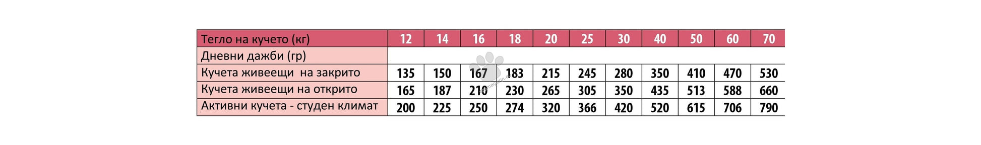 Инструкции за употреба: Препоръчителният дневен прием на храната (виж таблицата) може да бъде разделен на 2 дневни хранения. Индивидуалните хранителни нужди могат да варират в зависимост от размера, възрастта и нивото на активност на животното. Уверете се, че има чиста и прясна вода на разположение по всяко време. Когато този продукт замества друг вид храна и/или диета, се препоръчва да се въведе постепенно за период от поне една седмица. *Може да съдържа следи от други източници на протеини. Храна само за домашни любимци, не e подходяща за човешка консумация.