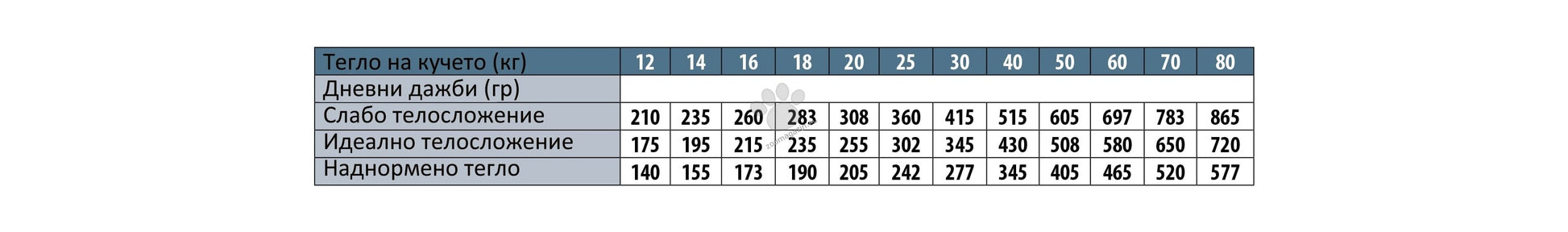 Инструкции за употреба: Препоръчителният дневен прием на храната (виж таблицата) може да бъде разделен на 2 дневни хранения. Индивидуалните хранителни нужди могат да варират в зависимост от размера, възрастта и нивото на активност на животното. Уверете се, че има чиста и прясна вода на разположение по всяко време. Когато този продукт замества друг вид храна и/или диета, се препоръчва да се въведе постепенно за период от поне една седмица. *Може да съдържа следи от други източници на протеини. Храна само за домашни любимци, не e подходяща за човешка консумация.