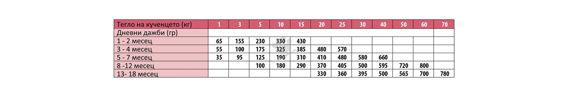Инструкции за употреба: Препоръчителният дневен прием на храната (виж таблицата) може да бъде разделен на 3 дневни хранения. Индивидуалните хранителни нужди могат да варират в зависимост от размера, възрастта и нивото на активност на животното. Уверете се, че има чиста и прясна вода на разположение по всяко време. Когато този продукт замества друг вид храна и/или диета, се препоръчва да се въведе постепенно за период от поне една седмица. *Може да съдържа следи от други източници на протеини. Храна само за домашни любимци, не e подходяща за човешка консумация.