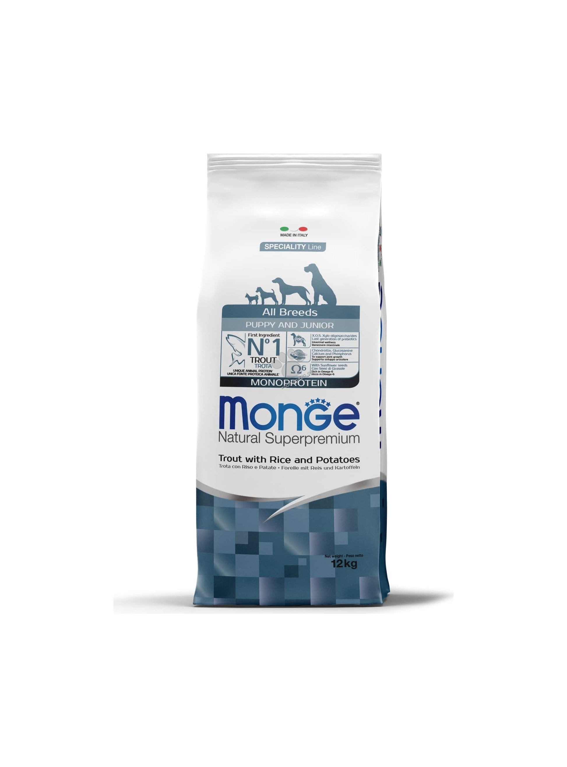 Monge All Breeds Puppy and Junior Monoprotein Trout with Rice and Potatoes - пълноценна суха храна за кученца от всички породи с пъстърва, ориз и картофи 12 кг