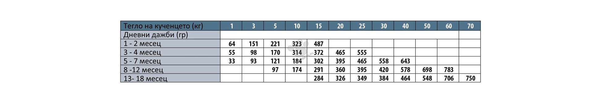 Инструкции за употреба: Препоръчителният дневен прием на храната (виж таблицата) може да бъде разделен на 3 дневни хранения. Индивидуалните хранителни нужди могат да варират в зависимост от размера, възрастта и нивото на активност на животното. Уверете се, че има чиста и прясна вода на разположение по всяко време. Когато този продукт замества друг вид храна и/или диета, се препоръчва да се въведе постепенно за период от поне една седмица. *Може да съдържа следи от други източници на протеини. Храна само за домашни любимци, не e подходяща за човешка консумация.