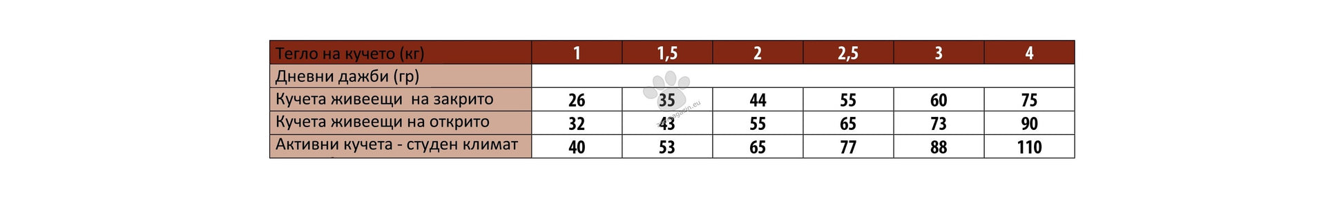 Инструкции за употреба: Препоръчителният дневен прием на храната (виж таблицата) може да бъде разделен на 2 дневни хранения. Индивидуалните хранителни нужди могат да варират в зависимост от размера, възрастта и нивото на активност на животното. Уверете се, че има чиста и прясна вода на разположение по всяко време. Когато този продукт замества друг вид храна и/или диета, се препоръчва да се въведе постепенно за период от поне една седмица. *Може да съдържа следи от други източници на протеини. Храна само за домашни любимци, не e подходяща за човешка консумация.