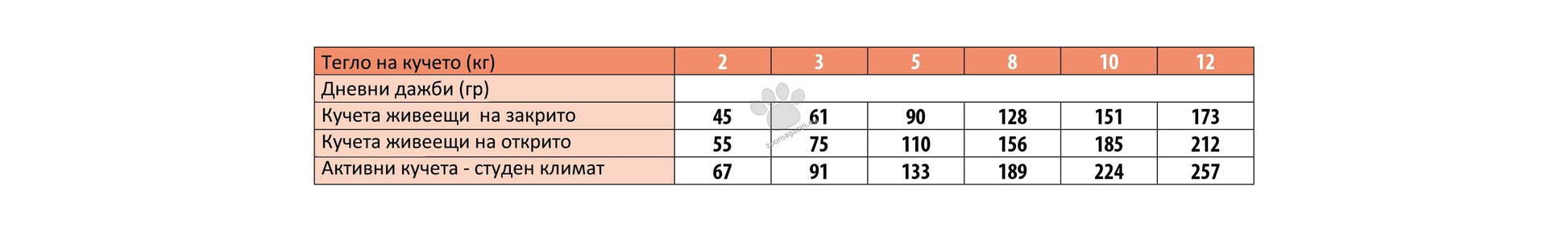 Инструкции за употреба: Препоръчителният дневен прием на храната (виж таблицата) може да бъде разделен на 2 дневни хранения. Индивидуалните хранителни нужди могат да варират в зависимост от размера, възрастта и нивото на активност на животното. Уверете се, че има чиста и прясна вода на разположение по всяко време. Когато този продукт замества друг вид храна и/или диета, се препоръчва да се въведе постепенно за период от поне една седмица. *Може да съдържа следи от други източници на протеини. Храна само за домашни любимци, не e подходяща за човешка консумация.