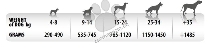 Инструкции за употреба: Дневната дажба може да бъде разделена на две хранения. Адаптирайте количеството според размера, активността и начина на живот на животното. Да се сервира на стайна температура. Уверете се, че винаги има на разположение прясна и чиста вода. Когато този продукт заменя друг е препоръчително да се въведе постепенно в продължение на поне 1 седмица.