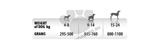 Инструкции за употреба: Дневната дажба може да бъде разделена на две хранения. Адаптирайте количеството според размера, активността и начина на живот на животното. Да се сервира на стайна температура. Уверете се, че винаги има на разположение прясна и чиста вода. Когато този продукт заменя друг е препоръчително да се въведе постепенно в продължение на поне 1 седмица.