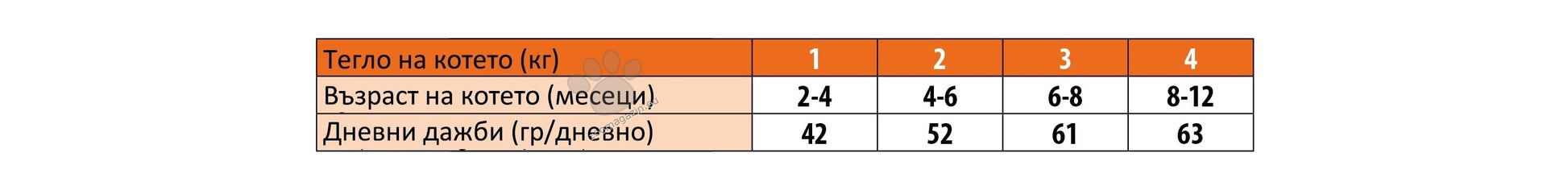 Инструкции за употреба: Препоръчителният дневен прием на храната (виж таблицата) може да бъде разделен на 3 дневни хранения. Индивидуалните хранителни нужди могат да варират в зависимост от размера, възрастта и нивото на активност на животното. Уверете се, че има чиста и прясна вода на разположение по всяко време. Когато този продукт замества друг вид храна и/или диета, се препоръчва да се въведе постепенно за период от поне една седмица. *Може да съдържа следи от други източници на протеини. Храна само за котки, не e подходяща за човешка консумация.
