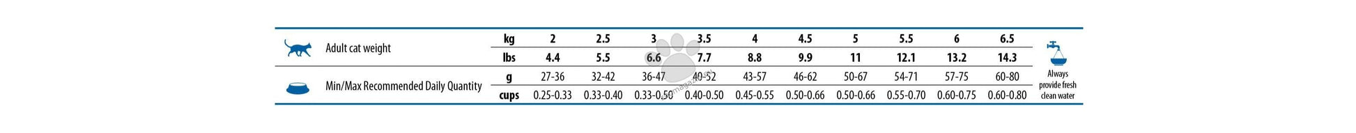 Аналитичен състав: суров протеин 31,00%; сурови мазнини 11,00%; сурови влакнини 6,50%; влага 8,00%; сурова пепел 8,20%; Калций 1,10%; Фосфор 0,90%; Магнезий 0,09%; Омега-6 2.00%; Омега-3 0,40%; DHA 0,15%; EPA 0,10%; Таурин 0,18%.