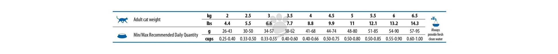 Аналитичен състав: суров протеин 32,00%; сурови мазнини 11,00%; сурови влакнини 2,70%; влага 8,00%; сурова пепел 8,30%; Калций 1,10%; Фосфор 0,90%; Магнезий 0,09%; Омега-6 2.00%; Омега-3 0,40%; DHA 0,15%; EPA 0,10%; Таурин 0,18%.