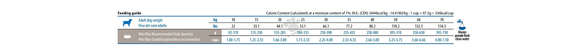 Аналитични съставки: Суров протеин 30.00%; сурови мазнини 11,00%; сурови влакнини 5,70%; влага 9,00%; сурова пепел 7,80%; Калций 1,20%; Фосфор 0,90%; Калий 0,60%; Натрий 0,35%; Магнезий 0,10%; Омега-6 мастни киселини 2.00%; Омега-3 мастни киселини 0,30%; DHA 0,10%; EPA 0,05%; Глюкозамин 1200mg/kg; Хондроитин сулфат 900 mg/kg.