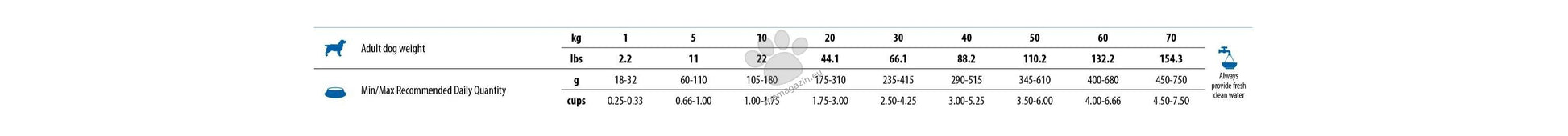 Аналитични съставки: Суров протеин 23.00%; Сурови мазнини 12.00%; Сурови влакнини 2.80%; Влага 9.00%; Сурова пепел 7.90%; Калций 1.10%; Фосфор 0.90%; Омега-6 мастни киселини 2.20%; Омега-3 мастни киселини 0.40%; DHA 0.20%; EPA 0.10%; Глюкозамин 1200мг/кг; Хондроитин сулфат 900мг/ кг.