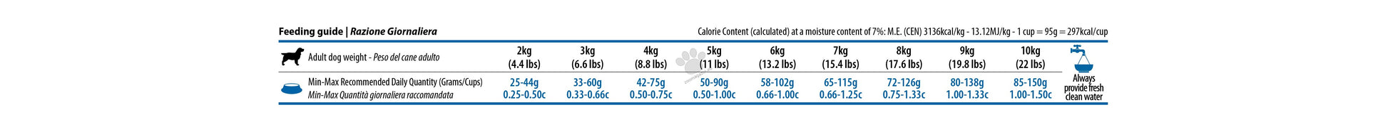 Аналитични съставки: Суров протеин 28.00%; Сурови масла и мазнини 8.00%; Сурови влакнини 8.20%; Влага 9.00%; Сурова пепел 7.90%; Калций 1.10%; Фосфор 0.90%; Натрий 0.30%; Калий 0.70%; Магнезий 0.13%; Омега-6 мастни киселини 1.20%; Омега-3 мастни киселини 0.25%; DHA 0.12%; EPA 0.10%; Глюкозамин 1200мг/кг; Хондроитин сулфат 900мг/кг.
