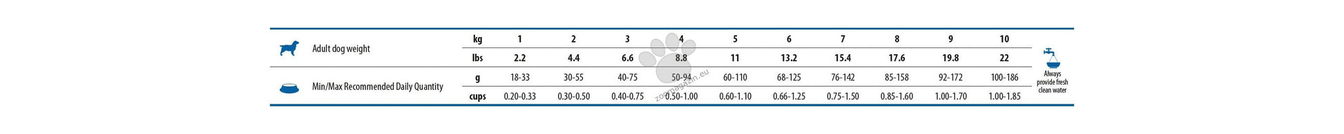 Състав: Херинга (24%), дехидратиран протеин от херинга (23%), сладък картоф, рибено масло (от херинга), сушена спирулина (5%), ленено семе , сушено годжи бери (2.5%), влакнини от грах, сушен морков, брашно от люцерна, инулин, фрукто-олигозахариди, екстракт от мая (източник на мано-олиго-захариди), сушен спанак, семена и люспи от псилиум, натриев хлорид, сушена бирена мая, куркума, екстракт от алое вера, глюкозамин, хондроитин сулфат.