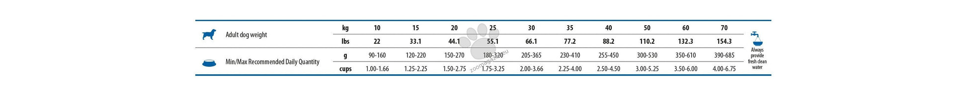 Състав: Херинга (24%), дехидратиран протеин от херинга (23%), сладък картоф, рибено масло (от херинга), сушена спирулина (5%), ленено семе , сушено годжи бери (2.5%), влакнини от грах, сушен морков, брашно от люцерна, инулин, фрукто-олигозахариди, екстракт от мая (източник на мано-олиго-захариди), сушен спанак, семена и люспи от псилиум, натриев хлорид, сушена бирена мая, куркума, екстракт от алое вера, глюкозамин, хондроитин сулфат.